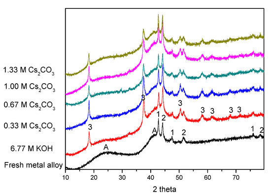 Weights of the cycled AR3 alloy electrodes were measured. After 10 cycles, weights of the alloy electrodes cycled in all of the electrolytes increased due to surface metal oxidation and the deposition of some salts. Surface metal oxidation during charge leads to the formation of surface metal hydroxide, such as Mg(OH)2 [11,16]. The majority of salt depositions are carbonates and bicarbonates [52]. Weight gains of the alloy electrodes cycled in the Cs2CO3-containing electrolytes are normalized to that in the 6.77 M KOH electrolyte and presented in Table 3. As the Cs2CO3 concentration in the electrolyte increases, the weight gain decreases. The addition of Cs2CO3 changes the physical and chemical properties of the electrolyte. Cs2CO3 reacts with the MH alloy surface during electrochemical cycling, which results in a protective layer and greatly decreases the reaction rate of metal oxidation. Therefore, the weight gain due to surface oxidation (listed in Table 3) is substantially reduced by the addition of Cs2CO3 in the electrolyte.