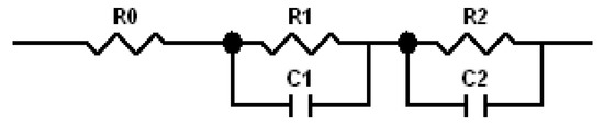 Cole–Cole plots obtained from the alternating current (AC) impedance measurements are shown in Figure 6. The reported equivalent circuit model for Ni-MH batteries using Mg-based alloy anodes is shown in Figure 7 [63,64,65,66,67]. Constant phase elements are used in this circuit model, due to the inhomogeneity properties of the electrode surface, such as porosity and roughness. Results obtained from the Cole–Cole plots are presented in Table 7. R0 represents the resistance of ions traveling through the electrolyte and separator. The electrolyte containing 6.44 M KOH + 0.33 M Cs2CO3 shows the lowest R0, which is consistent with its high discharge capacity, low degradation, and similar HRD compared with the 6.77 M KOH electrolyte. R1 is the resistance among alloy particles and increases as the Cs2CO3 concentration increases. R2 is the whole electrode resistance, and the addition of Cs2CO3 greatly decreases R2 compared with the pure KOH electrolyte. C1 represents the particle capacitance, which is closely related to the contact area among alloy particles. With increasing Cs2CO3 concentration, C1 decreases. C2 is the electrode capacitance, which is an indication of the amount of the active area in the electrode. Table 7 shows that the addition of Cs2CO3 decreases C2 as well. The product of R2 and C2 represents the electrode activity performance [68,69], and a smaller value suggests better electrochemical performances. Table 7 shows an optimized R2·C2 value at 5.77 M KOH + 1.00 M Cs2CO3.