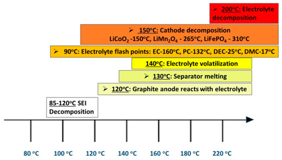Prior to commercial availability, a battery will undergo a formation cycle. This allows for the creation of a protective layer on the electrodes, generated from the decomposition of a small amount of electrolyte solution on the surface of the electrodes. This is termed the ‘solid electrolyte interphase’ (SEI). Following a short circuit event the localised temperature inside the cell begins to rise and at 100 °C the SEI film begins to decompose [11]. A series of exothermic reactions follow between SEI compounds and electrolyte solvents such as ethylene carbonate (EC) and diethyl carbonate (DEC). When this cascade of reactions proceeds uninterrupted, it causes a rapid elevation of the internal temperature whereby a series of reactions can generate large volumes of flammable hydrocarbon gases, which will vent to atmosphere—see Figure 1 [12,13,14,15].
