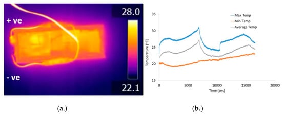 (a.) Thermal imaging at 180 minutes charging and (b.) Operational temperature profile.
