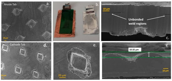 Figure 5 shows SEM images of the anode and cathode welded tab regions that transport current (charge) to the battery electrodes. This is typically used because conventional fusion welding processes (such as resistance spot welding and laser welding) are faced with challenges in joining multiple sheets of highly conductive, dissimilar materials over large areas [30]. The fusing together of cell current collectors and tabs achieved by ultrasonic welding uses high-frequency energy ≥20 kHz to generate oscillating shears at the interface between a sonotrode and metal sheets. This produces solid-state bonds between the sheets clamped under pressure in a period of time less than a second [31]. Thus, the solid-state mechanism of the ultrasonic process is better suited to generating weld joints with higher integrity.