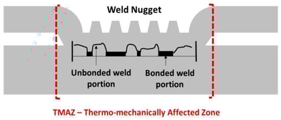 Evident within this type of welding is material flow, whereby excessive plastic deformation can thin and negatively affect the weld quality [30]. This can result in pieces of material from the thermomechanically affected zone (TMAZ), becoming detached and the weld bond being discontinuous. Cells from Manufacturer B were reported to have sharp protrusions in the welded tab region of the cathode, in the region of the thermomechanical affected zone—see Figure 6 for a description of key attributes in ultrasonic welds. UL and Exponent released independent reports of their testing on the Note 7 and reported internal cell faulting between the positive electrode tab welding defects and the anode copper foil directly opposite the defective welds—depicted in Figure 7 [32]. The figure shows sharp and relatively tall welding defect features and the report suggested a short circuit occurred between the weld defect features on the positive tab and the copper of the negative electrode, resulting in thermal runaway at high states of charge [32].