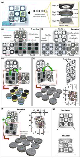 The sufficient number of the bacterial cells can be stored intact without losing their electron-generating capacity until used, and be readily activated by various liquids available in any challenging area. Very recently, we demonstrated an MFC battery stack fabricated on a single sheet of paper that allowed on-demand activation with human saliva [29,30]. All of the functional layers for the fuel cell architecture were precisely designed in the paper sheet, and 16 MFC units were connected in a series to increase the power and output voltage. However, several practical challenges remain. First, the device (16 cm × 10 cm) was too big to carry around. This is because the metallic wires and electrical switches had to be patterned and mounted, respectively, on the paper to connect the MFCs in series, taking up 18% of the device. The electrical switches were necessary, because individual MFC units must be disconnected until they reach the maximum performance level. Otherwise, a voltage reversal from the weakest unit will take place, reducing the overall battery performance [31]. Second, the anodic chamber volume was very limited, because of the other necessary components (i.e., membrane and cathode) that needed to be integrated into a single sheet of paper. Since the anodic chamber volume determines the actual surface area for the bacterial attachment, this limiting factor can substantially reduce the performance of the MFC [26,29].