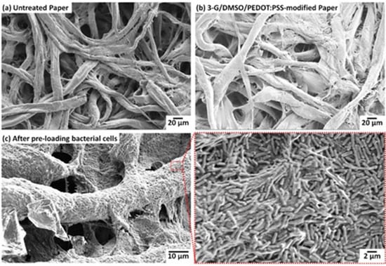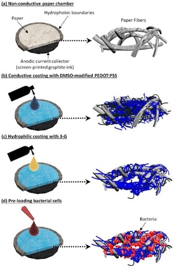 In order to hold the exoelectrogens in liquid and harvest electrons from the cells distributed by capillary action throughout the 3-D porous structure of paper, each paper fiber needs to be hydrophilic and conductive (Figure 2). Conducting polymers such as poly(3,4-ethylenedioxythiophene):poly(styrene sulfonate) (PEDOT:PSS) have been widely used to fabricate conducting papers, as they possess controllable electrical conductivity ranging from semiconductors to metals [32]. Many studies demonstrated that the conductivity of the PEDOT:PSS can be substantially improved by mixing it with other solvents such as dimethyl sulfoxide (DMSO) and ethylene glycol (EG) [27,28,29,33].