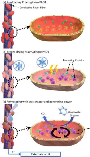 For on-demand power generation and a long shelf life for the biobattery, the exoelectrogens were preloaded and freeze-dried in the engineered anodic chambers (Figure 5). The preloaded exoelectrogens covered the conductive paper fibers three-dimensionally and conformally, forming densely packed biofilms (Figure 3c and Figure 5a). Then, the cells were freeze-dried, keeping them intact through the freezing, sublimation, and desorption processes (Figure 5b). Freeze-drying has been widely used for the long-term preservation of bacterial cells [35,36]. Although not all bacterial strains survive the process, and further studies on exoelectrogens are required, freeze-drying allows the MFC technology to find more applicable and potentially realizable applications as a practical and accessible power supply in remote and resource-constrained environments. We previously demonstrated that the wild-type Pseudomonas aeruginosa PAO1 can be freeze-dried and rehydrated so that their metabolism generates power (Figure 5c) [29]. Furthermore, our recent literature survey indicates that P. aeruginosa can produce protecting proteins under oxidative stress such as freeze-drying (Figure 5b) [37,38], which will probably improve their survival rate during the process.