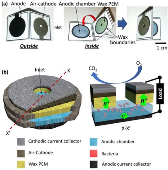 Microbial fuel cells (MFCs) are one of the most exciting new energy-scavenging technologies, especially for use in remote and resource-limited environments [1,2,3]. MFCs harvest bioelectricity from any biodegradable organic compounds (e.g., wastewater) via microbial electron transport chains. Existing MFCs have limited power generation, reducing their possible applications [4,5]. However, the technology remains attractive as a self-sustainable power supply, even in challenging environments. The MFCs have unique advantages over other energy-harvesting techniques, including (i) on-demand and rapid power generation without charging; (ii) low-cost materials and easy fabrication; and (iii) self-assembling and self-repairing bacterial features that make the MFCs (iv) self-sustainable and eco-friendly. Furthermore, the technique can be useful for powering underwater wireless sensor networks [6]. Many research groups have revolutionized the MFC technique and its applications by miniaturizing the device for powering standalone and portable electronics that require low energy consumption, but simple and fast energy production [7,8,9,10,11,12]. One of the excellent application examples of the miniaturized MFCs powers disposable point-of-care (POC) biosensors, demanding only tens of micro-power for a couple of minutes [13,14,15]. Recent paper-based miniaturized MFCs are attracting more attention as a power source because they fulfill the ASSURED biosensor criteria that the World Health Organization defined for diagnostic devices in developing countries: Affordable, Sensitive, Specific, User-friendly, Rapid and robust, Equipment-free, and Deliverable to end-users [16]. Paper MFCs can be readily incorporated in those ASSURED biosensors for easy system integration, offering low-cost, disposable, rapid, and simple power generation without external equipment [17,18,19,20,21,22,23,24,25,26]. The biocompatibility and fiber structure of paper induces the formation of a densely packed biofilm and generates high performance, as they provide a large surface area for bacterial attachments and a porous structure for the efficient mass transfer of ions, nutrients, and byproducts. Significant advances in technology allow us to add patterned conductive and hydrophilic characteristics to paper, increasing its suitability as a substrate for MFCs [27,28,29]. The added characteristics allow the effective harvesting of electrons from the MFCs. In addition, our recent ability to freeze-dry electricity-generating bacterial cells (or exoelectrogens) in paper allowed a long battery shelf life and the easy activation for a self-powered device in resource-limited settings [29].
