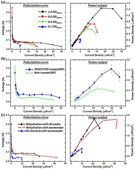 Polarization curves and power outputs measured from the single MFCs (a) with different concentrations of non-freeze-dried bacterial cells; (b) with 1.0 OD600 culture of non-freeze-dried cells in the anodic chamber with or without PEDOT:PSS treatment; and (c) with rehydrated freeze-dried cells (1.0 OD600 culture) in a different liquid. A control without bacterial cells was also prepared for comparison.