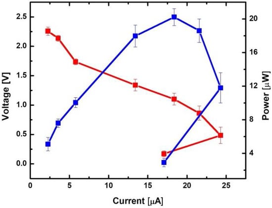 Five repeated measurements with other MFC stacks had a relative standard deviation of less than 3.5%. The open circuit voltage of the battery stack was 2.3 V, and its maximum power and current were 20 μW and 25 μA, respectively (Figure 8), which can be further improved by simply adding more MFCs and tabs within a small and single unit. This MFC stack platform is a great example of how easily paper can be folded and unfolded with the origami technique, and how multiple batteries can be combined in a compact manner.