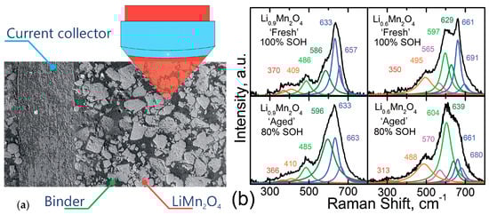 - Anzue, N. In Situ Raman Spectroscopic Study of Thin-Film Li1−xMn2O4 Electrodes. Solid State Ionics 2003, 156, 301–307. [Google Scholar] [CrossRef]