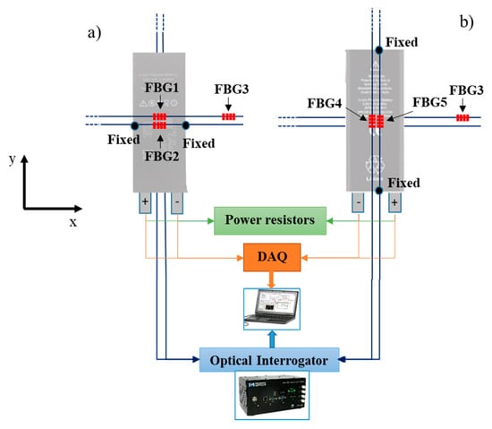 A network of five FBG sensors, recorded in two different fibers, was placed in direct contact with the LiB surface on the x- and y-directions, as schematized in Figure 1. The FBGs network used in the monitoring system, with estimated gratings length of ~3.0 mm, was pre-fabricated in our lab and written in commercial photosensitive single mode fiber (125 µm of cladding diameter) (FiberCore PS1250/1500) by the phase mask method. The UV radiation system used was a pulsed excimer laser (KrF) (Industrial Bragg Star, Coherent, CA, USA), emitting at a wavelength of 248 nm, 4 mJ/pulse (20 ns duration), and 500 Hz repetition rate.