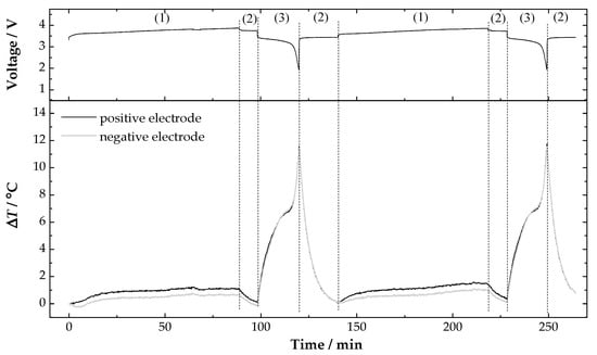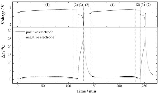 Figure 3. Voltage and temperature variations recorded during two cycling tests, in the sides of the positive and negative electrodes of the battery. (1) CC charge; (2) CV; (3) CC discharge at 5.77 C.