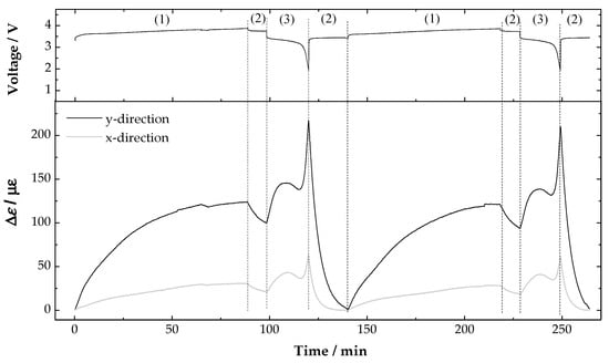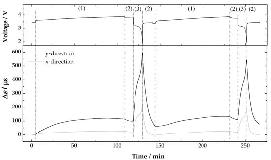 Figure 5. Voltage and strain variations recorded during two cycling tests in the battery in the x- and y-directions. (1) CC charge; (2) CV; (3) CC discharge at 5.77 C.
