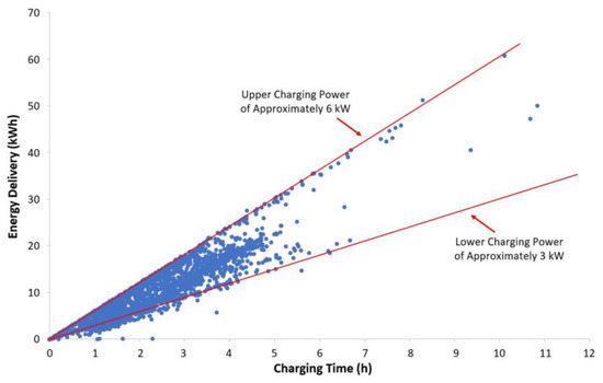 25]. However, charging power varies subject to different EV batteries and initial battery levels. The scatterplot of energy vs. charging time can be used to compare the charging stations’ maximum output power with the operational output power.