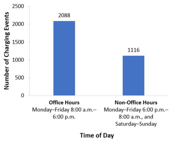 Typical UGA office hours are from 8:00 a.m. to 6:00 p.m. on Monday through Friday. To evaluate the effect of office hours on charging station occupancy levels, a bar graph was created to compare the number of charging events during and outside of typical office hours.