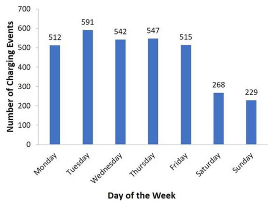 Bar graph comparing the number of charging events which occurred on each day of the week