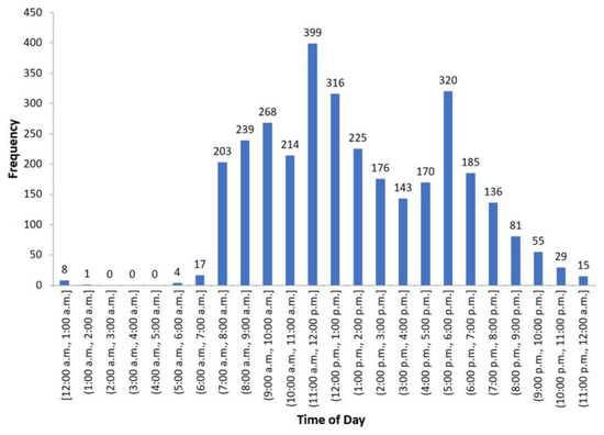 Histogram of frequency of charging events by time of day (one hour per bar)
