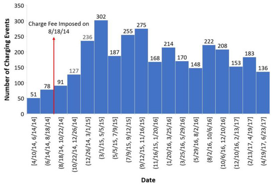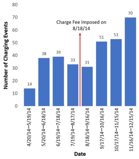 26]. A bar graph was created comparing the number of charging events which occurred during each of four 30-day intervals before the onset of the electricity fee, and four 30-day intervals after the onset of the electricity fee at the charging stations (the first 30-day interval after the fee includes the first day the fee was implemented, which was 18 August 2014). This graph can be used to visualize and calculate whether the electricity fee coincides with any changes in charging station usage (especially whether occupancy decreases after fee implementation).