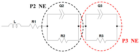 At the impedance spectrum of the negative electrode, two semicircles are distinguishable in all SoCs and at both aging levels (Figure 1). The first semicircle is located at high frequencies, between 10 kHz and 60 kHz, and shows a small radius (P2_NE), illustrated in the insets of Figure 1. The second semicircle (P3_NE), which shows the highest impedance contribution, is located at medium frequencies (between 120 Hz and 350 Hz depending on SoC and aging) (Figure 1a,b). Moreover, there is a third semicircle at very low frequencies (below 1 Hz), which can only be identified at lowest and the highest negative electrode (NE) SoCs. However, this third semicircle has not been investigated because only frequencies above 1 Hz have been fitted. Thus, we selected the number of RQ networks (see Figure 2) depending on the number of semicircles we could identify in the frequency range of interest (as is also found in Reference [35]). In these conditions, the most appropriate electrical model to describe the behavior of these half-cells at 25 °C is composed of an inductive part (L), a pure resistive component (R1), and two RQ networks (Figure 2).