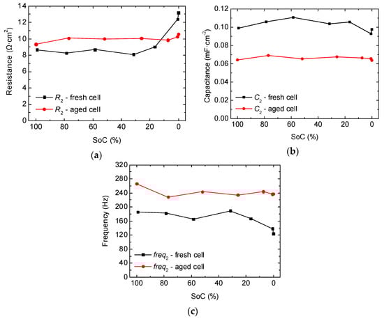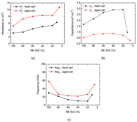 Regarding the variability of these parameters with aging, the characteristic frequency increases, the resistance corresponding to P2_FC also increases except at the lowest SoCs, and C2 decreases (Figure 12). The increase in resistance corresponding to the SEI layer is expected because it is well-known that SEI increases in thickness during continued cycling [7,9,21,41]. Likewise, the increase in thickness (represented as d in Equation (4)) would reduce the capacitance. This coincides with the obtained results (Figure 12b). Concerning the increase in the characteristic frequency (Figure 12c), even though one would expect a decrease in frequency due to the slowdown in the transport of ions across the SEI layer, we find that a slight increase in the characteristic frequency has also been stated in Reference [55]. They demonstrated that Mn migration during cycling from the positive electrode to the negative electrode causes an increase in the characteristic frequency of the SEI layer. Furthermore, this Mn-contamination also produces a decrease in resistance, which can also be appreciated in our results at low SoCs (Figure 12a). In fact, in a previous work [40], we detected the presence of 0.1% of the total Mn at the negative electrode of these cells by inductively coupled plasma (ICP) measurements. Thus, this could be the cause for the increase in frequency with aging in the SEI layer. Regarding the decrease in resistance, Gordon et al. demonstrate that it is compensated by the increase in resistance due to cycling [55]. Thus, one possible explanation to the decrease in resistance that we only detected at low SoCs, might be that at medium and high SoCs, the effect of cycling predominates over the manganese.