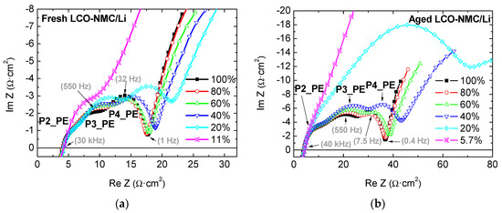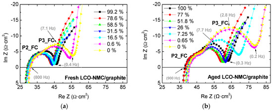Nyquist representation of impedance evolution with the SoC of (a) a fresh LCO-NMC cell and (b) a cycle-aged LCO-NMC cell. Measurements are carried out at 25 °C. Some frequencies are indicated by arrows.
