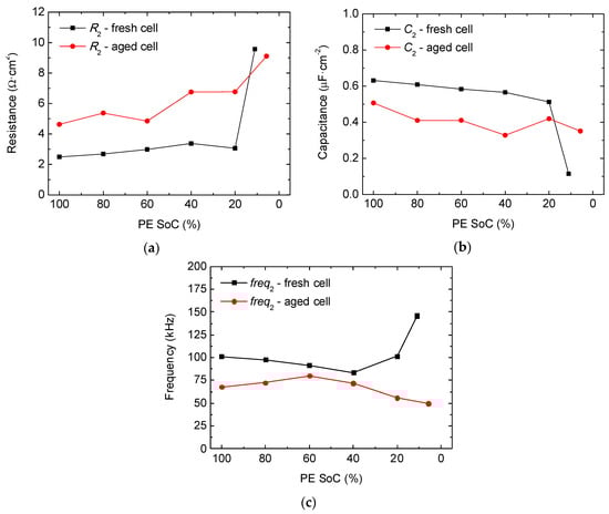 (a) Resistance, (b) capacitance, and (c) characteristic frequency related to P2_PE measured at the LCO-NMC/Li half-cell at 25 °C. This effect has been attributed to the current–collector interface.