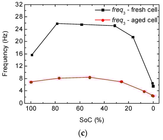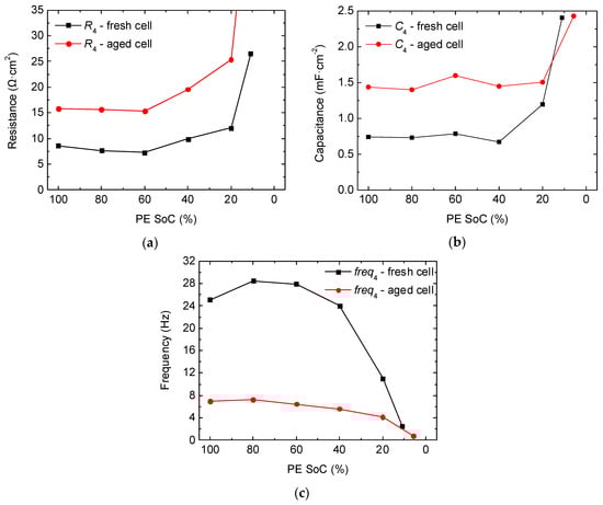 Considering P3_FC, we find that both resistance and capacitance increase at extreme SoCs (Figure 13a,b). Similar results have already been reported in Reference [41], in which a minimum of resistance is also found at intermediate SoCs. During the aging test, the characteristic frequency at intermediate SoCs of P3_FC is located around 28 Hz in the case of the fresh cell and 8 Hz in the aged state. This evident decrease in frequency indicates a great slowing-down—by a factor of around 3.5—of the process due to the cycle-aging test (Figure 13c). Actually, if P3_FC (Figure 13) and P4_PE (Figure 7) are compared, tendencies and absolute values of resistance, capacitance, and characteristic frequencies completely match. Thus, P3_FC corresponds to P4_PE and represents a charge-transfer process that takes place at the surface of the positive electrode. For further validation of the results, we also determined in a previous work the charge-transfer resistance by measuring the overpotential generated at three different low discharge rates (in order to be at the linear regime of Butler–Volmer equation) [40]. Then, we obtained charge-transfer resistance by calculating the slope of the obtained V-I curve. As a result, we obtained comparable values by using these two approximations. The results can be found in Reference [40].