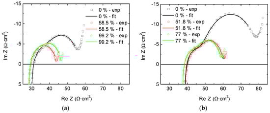 In our impedance measurements, we identified a diffusive part, which was represented at the Nyquist plot by a diffusive branch at the lowest frequencies. However, this transport phenomenon was not considered in this study because we wanted to focus on ohmic and activation terms; diffusion is going to be analyzed separately in future work. Therefore, we fitted the model at frequencies above the diffusive branch, avoiding the overlapped part of the semicircle located next to that branch. Nevertheless, the avoided part of this semicircle was small compared to the total perimeter of the semicircle, which allowed the convergence of fitting. Concretely, fitting was performed with Z Fit software provided by Bio-Logic. The adjustments were performed following two minimization algorithms. Firstly, randomization was applied for 5000 iterations in order to initialize the variables, and then Simplex was applied for another 5000 iterations.