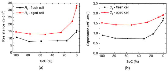 We find that serial resistance (R in Figure 9) slightly increases as the SoC decreases (Figure 11), as it has already been stated in other studies [28,41,51]. The SoC dependency of this resistance cannot come from the electronic conduction but comes from the ionic conductivity of the electrolyte because it depends on the concentration of ions [52]. Moreover, we find that serial resistance increases by a factor of 1.35 because of the cycle-aging process, which could be reasonably attributed to the decomposition of the electrolyte [28].