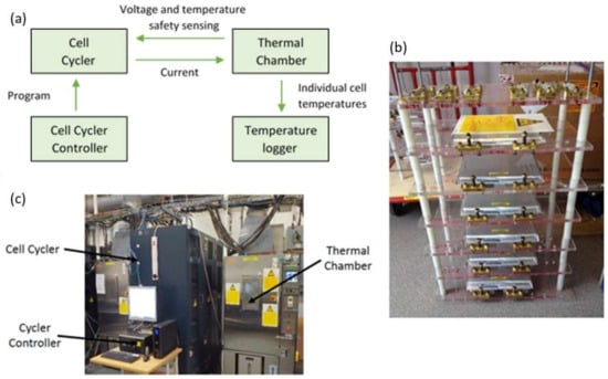Figure 1a presents a schematic diagram of the experimental set-up and Figure 1b shows a photograph of the cell mounting fixture employed to electrically connect the 12 cells under test to a commercially available cell cycler (Bitrode MCV 16-100-5). Given the electrical rating of the cell cycler (100 A at 5 V per channel), in order to meet the desired electrical loading each pouch power cell was driven from two output channels connected in parallel providing an effective capability of 200 A at 5 V. The photograph in Figure 1c of the actual laboratory equipment employed shows the host personal computer (PC), a Bitrode cell cycler, and an Espec thermal chamber. From the manufacturer’s documentation, the output current resolution of the battery cycler is 10 mA. The cell’s terminal voltage was measured at a sample rate of 100 ms, and with an accuracy of 50 mV/bit using the on-board 10-bit analogue-to-digital converter. The Espec thermal chamber controlled the ambient temperature for the cells at the target temperature of 25 °C to an accuracy of ±1 °C. In order to monitor the surface temperature of the cells during the experiments, T-type thermocouples were connected to the surface of the cells in the locations shown in Figure 2. The cell surface temperature was recorded at a sample rate of 1 Hz with an accuracy of 0.5% of the measured value.