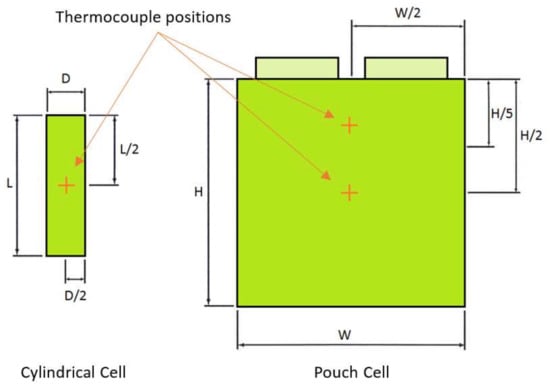 Cell temperature measurement locations for both the 18,650 cells and the pouch cells.