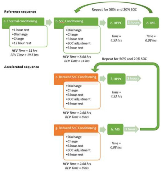 The cell thermal conditioning is not performed again prior to the accelerated sequence since it has been implemented before the reference sequence and a 3 h rest is sufficient to ensure the cells have reached thermal and electrochemical equilibrium. The reference SOC conditioning is accelerated for the accelerated sequence (step e and g), i.e., no rest to allow for thermal stabilisation in between discharge and charge, and after the charge (Table 2). A three-hour rest period was implemented in between the reference sequence and the accelerated sequence to allow for thermal stabilisation. Similarly, following the HPPC (step f), a 3 h rest is introduced to ensure the cells have reached thermal and electrochemical equilibrium before repeating accelerated sequence 2 for the remaining SOCs.