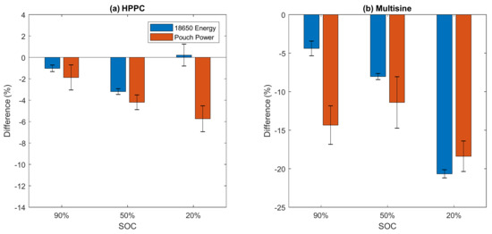 The percentage difference between the reference and accelerated internal resistance from HPPC and PM for both cell types (18,650 energy cell and pouch power cell) are shown in Figure 5.