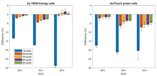 The HPPC measurement is not as greatly affected by the temperature increase from the SOC adjustment, as it is estimated from a least squares fit of all five pulses and from Figure 6b that only the first discharge pulse is carried out at a higher temperature. This is corroborated by measuring the internal resistance of individual pulses: Figure 7 shows the percentage difference in resistance between the accelerated and reference HPPC measurements for each discharge pulse.