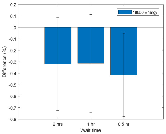 The PM signal performed at 50% SOC with an hour wait time characterises the internal resistance within the measurement error (0.34%) and it only takes 65 min, compared to a 3.2 ± 0.3% underestimation for the full accelerated HPPC sequence performed at 50% (see Figure 5), which takes 272 min to perform. The PM method is therefore more robust than the HPPC sequence, whilst taking less than a quarter of the time (65/272) of the full HPPC sequence. It is therefore recommended that PM be performed with 1 h wait after accelerated preconditioning, as this test is faster, more robust, and provides more meaningful measurements than a full HPPC test. The PM method with one hour wait only requires 3.8 and 8.2 h to perform for HEV and BEV cells, respectively, compared to the standard HPPC protocol in [29], which takes 13.2 and 18.5 h respectively, which yields a time saving of 10 h. These results confirm that internal resistance measurements can be accelerated for 18,650 energy and pouch power cells, whilst maintaining accuracy within the measurement error (0.34%), and this suggest that large reductions in EOL test time for EV LIB are attainable. Reducing the experiment duration may facilitate further EOL options for the EV and HEV battery systems used. Furthermore, accelerated internal resistance measurements may speed up and increase throughput in LIB manufacturing and remanufacturing, thereby using less energy and reducing CO2 emissions. This is predominantly important in remanufacturing, where it is likely that all LIB will be tested at the beginning of the remanufacturing process, in order to identify which cells require remanufacturing/replacing. In order to meet the commonly accepted requirement that a remanufactured item should be of identical quality as the original product, the remanufacturers will also want to test all their products to ensure that they have the same performance. The recommend testing protocol would allow up to two and four times as many cells to be tested for BEV and HEV applications respectively.