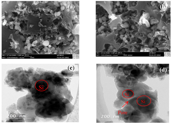 | Mesoporous C/Si composite | 76 wt% | No | 1 M LiPF6 in a mixture of FEC:DMC (1:1 by volume) | specific capacity of 1018 mAh g−1 after 100 cycles at a current density of 500 mA g−1 [12] |