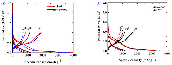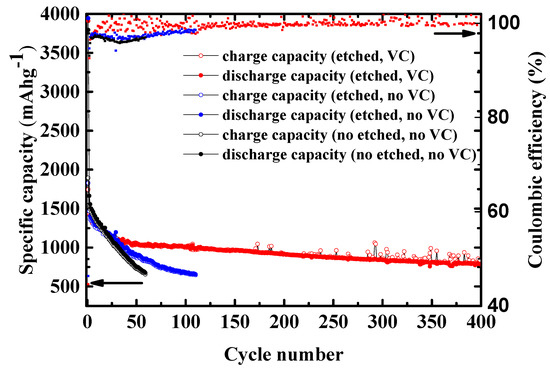 | Electrodes | Si Content | HF Etching | Electrolyte | Electrochemical Performance |