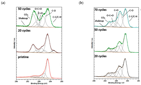 - Martin, L.; Martinez, H.; Ulldemolins, M.; Pecquenard, B.; Le Cras, F. Evolution of the Si electrode/electrolyte interface in lithium batteries characterized by XPS and AFM techniques: The influence of vinylene carbonate additive. Solid State Ionics 2012, 215, 36–44. [Google Scholar] [CrossRef]
