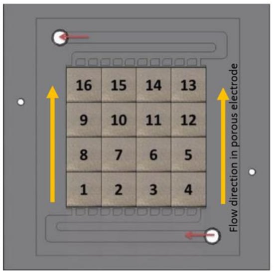 The bipolar plate on the negative half-cell was divided into the sixteen segments. The arrangement of sixteen segments with electrolyte flow direction is shown in Figure 1. The total active area of the cell was 100 cm2.