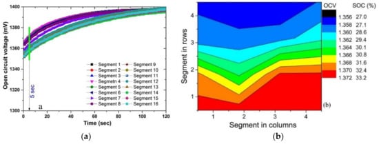 Figure 2a shows an OCV profile of sixteen segments against time after the termination of discharge at the current density of 80 mA cm−2. A wide separation of OCV is obtained due to the segmentation, which equilibrates eventually. The equilibration time was a function of the flow rate and current density.