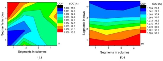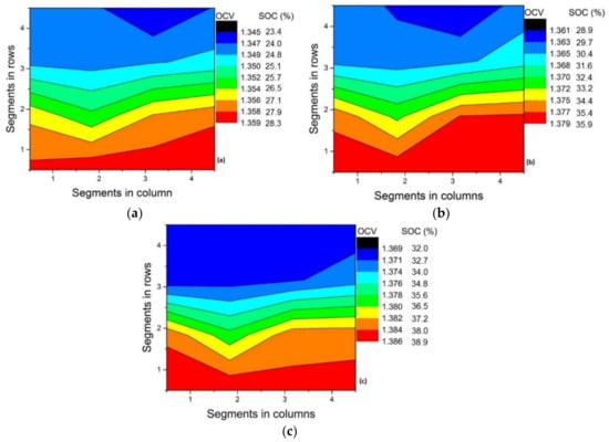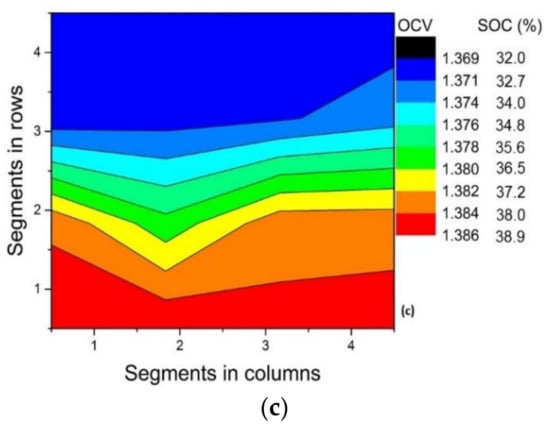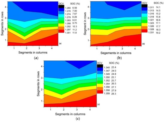 A nearly flat band-type distribution of the OCV along the cross-section of the electrode is observed for the modified electrodes (Figure 3b,c). The distribution of the OCV/SOC contour, however, is random for the pristine electrode, as shown in Figure 3a. This is expected as wetting of the pristine electrode is poor and non-uniform and, hence, results in poor kinetics. The modified electrodes exhibit increased performance in comparison to pristine electrodes [2,3,4,28]. Their better wettability produces a uniform electrolyte distribution. Ideally, flat band-type voltage distribution along the cross-section is expected for a highly homogeneous flow distribution. The small variations in voltage along the cross-section might be caused by minor variations in electrode compression in the large active cell area, non-uniform activation of the electrode and non-uniformity in felt thickness. Nevertheless, the variation along the cross-section is negligible and it can be concluded that the flow distribution improved substantially with the activation of the felt. Monitoring the OCV at the inlet segments in each contour (Figure 3), it can be observed that the OCV reached its minimum (of 1.306 V) after terminating the discharge in the case of pristine electrode. This again reflects the higher Ohmic drop for the cell assembled with the pristine electrode. Table 2 compares the ΔSOCth and ΔSOCexp.