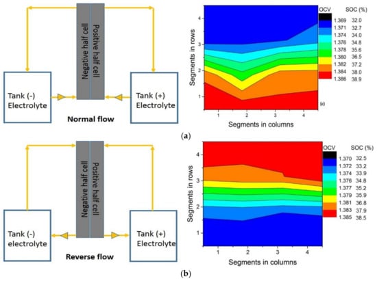 Figure 6a,b compares the OCV/SOC distribution for normal and reverse flow, respectively. Clearly, the OCV bands appear to be almost completely inverted for both settings. This supports our claim that OCV or SOC contour closely mirrors the flow distribution across the electrode.