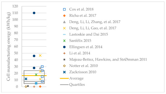 Cell manufacturing energy in the literature. The grey box shows the quartiles.