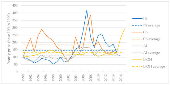 Considering the high variability of commodity prices (Figure 2), the cathode active material price is studied in detail. For nickel, cobalt, and aluminium, the yearly prices are retrieved from [40]. There is not one established lithium index. The LiOH price is retrieved from [41] for monthly lithium hydroxide prices from 2009 to 2017. For previous years, the lithium hydroxide price is assumed to be 8% of the lithium metal price [40].