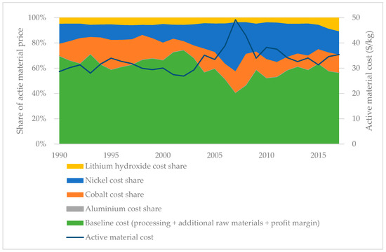The average active material price was 33 $/kg (minimum 26.9 $/kg in 2002 and a maximum of 49 $/kg in 2007, Figure 3) for the period between 1990–2017, which is 39% higher than the figures in [24], but in accordance with [12,15,16]. Nevertheless, the assessed materials can be slightly different (metal content, particle size, and shape, …), and the production volume can also differ, as pointed out by [16]. However, the baseline cost is the biggest cost contributor to the active material cost. On the other hand, aluminum is the smallest cost contributor, due to its lower cost compared to the other metals that were assessed in this study. Even though the cobalt content in NCA is low compared to other cathode materials, it costs between 10–25% of the active material. Figure 3 shows that the cathode active material is relatively stable over time despite the commodity price volatility.