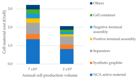 In the total material costs of a cell, the cathode is—with the separators—the component that has the highest share of the material costs (Figure 4). For an NMC cylindrical cell, Brodd and Helou [10] showed that the cathode active material is the biggest cost contributor, before the cell container, the active anode material, and the separators. However, our cells contain ceramic-coated separators that improve cell thermal stability, but have a higher price per area [16] compared to polyolefin separators.