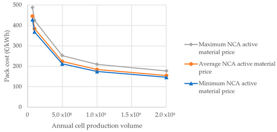 Our pack cost estimate ranges between 147–492 €/kWh (Figure 5), while the pack cost estimate ranges from 171–440 €/kWh for 2020 [2] (using the €/$ exchange rate on 5 November 2018). Most LIB cost assessments focus on LIBs without specific details regarding its chemistry [5,50]; nevertheless, we focus on a battery pack with NCA as active material. Battery manufacturers also tend to reduce prices in order to attract investors to increase their production capacity [5], so the manufacturing cost may not reflect the market price. Our estimate is in accordance or slightly lower than [15] for NCA, even though they do not include profit margin, and calculate cost per kWh of usable energy.