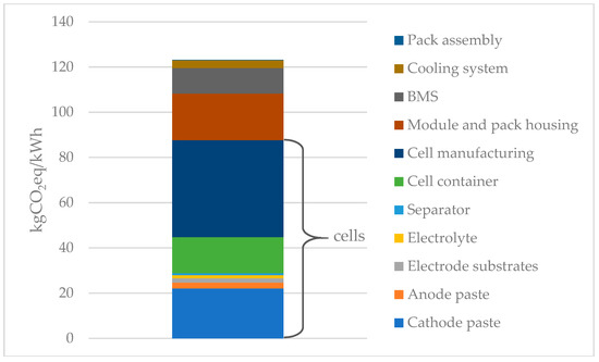 The impact of our battery pack on CC, which was manufactured in an average capacity plant in Korea, was at 71% driven by the cells (Figure 6). The high impact of the cells is common even for other LIB chemistries [30,52,53]. In studies that focused on NCA batteries, the main contributors to the impact of battery production on CC were the cell manufacturing energy, the NCA active material, and aluminum [11,14], which is coherent with our findings.