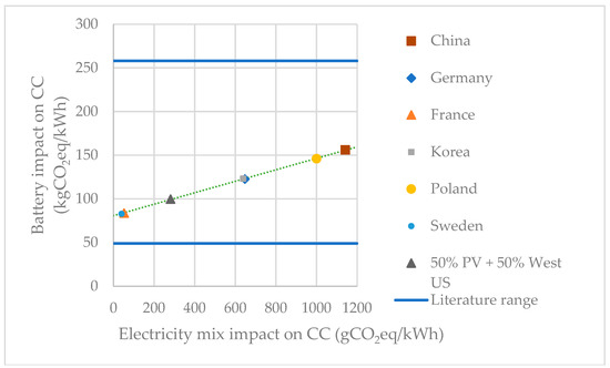 For countries with electricity produced mainly from fossil fuels, the impact on CC of a pack is mainly due to the electricity production (60% for a pack manufactured in China). On the other hand, for countries with less carbon-intensive electricity production, materials contribute relatively more. The cathode paste, the cell container, and the module housing emit 26.6%, 19.2%, and 18.8% of the GHG respectively for a pack manufactured in Sweden. The electricity mix that is used to manufacture the pack almost explains the differences between countries that is observed in Figure 7. The correlation between the GHG emissions of the electricity mix and the pack manufacturing impact on CC is shown by a linear regression (R2 = 0.999696). The ratio between the carbon intensity of the Chinese and Swedish electricity mix is almost 30. The Chinese electricity production is mainly based on hard coal, while the Swedish electricity production is based on hydropower and nuclear energy. One of the highest values in the literature (258 kg CO2 eq/kWh) is obtained for a battery manufactured in Asia, with an electricity mix carbon intensity of one kg CO2 eq/kWh [13].