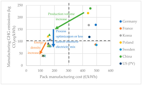 In Section 2.2, the high variability in the literature of the energy consumption for manufacturing was mentioned. The lowest value found in [31] can be considered an optimized production process, which is 36 times lower than the average value. This value leads to reduced differences in GHG emissions between countries (between 80.3–83.2 kg CO2eq/kWh). Therefore, optimizing the production process is another way to reach the lower left quadrant for factories that are located in countries with an electricity mix based on fossil fuels (blue arrow).