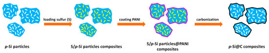 Figure 1 displays the preparation process of p-Si@C composites. Sulfur/p-Si particles composites were prepared before polymerization by a melting–diffusion method. Sublimed sulfur (≥99.5 wt.%, Chengdu Kelong Chemical Reagent Factory) and p-Si particles with a mass ratio of 2:1 were milled for 30 min. The mixture was heated, first, at 155 °C for 8 h under N2, and then the temperature further increased to 200 °C and held for 2 h, during which the heating rate was 0.5 °C·min−1.